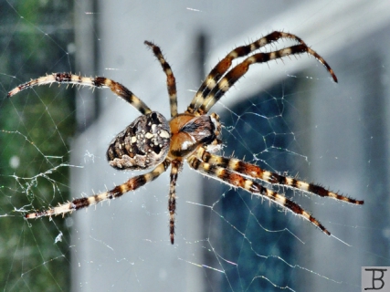 Mehrere hundert Arten von Kreuzspinnen gibt es weltweit und die gehören lt. Wikipedia, nach der Art ihrer gesponnenen Fangnetze, zu der Familie der Radnetzspinnen. Leider sind diese wunderschönen Tiere meist nicht allzu beliebt und ich habe immer beim Betrachten dieses Bildes die wilden Schreie meiner Tochter und die Hilferufe meiner Frau in den Ohren, wenn diese eine Spinne im Zimmer hatten. Gut, auch ich mag nicht alle Spinnen gleichermaßen, aber die hier im Bild zu sehende Kreuzspinne ist nun doch ein besonders schönes Exemplar. Ich weiß noch, wie lange ich damals gewartet hatte, bis das Tierchen sich so platziert hatte, dass ich den markanten Rücken gut fotografieren konnte. Die Kreuzspinnen sind auf der ganzen Erde beheimatet und bei uns in Mitteleuropa existieren alleine 10 Arten. Ihren Namen bekam das Tier, wie sollte es anders sein, von dem charakteristischen Kreuz, das sie als Zeichnung auf dem Rücken trägt.